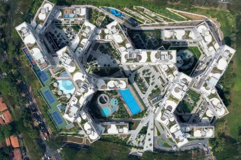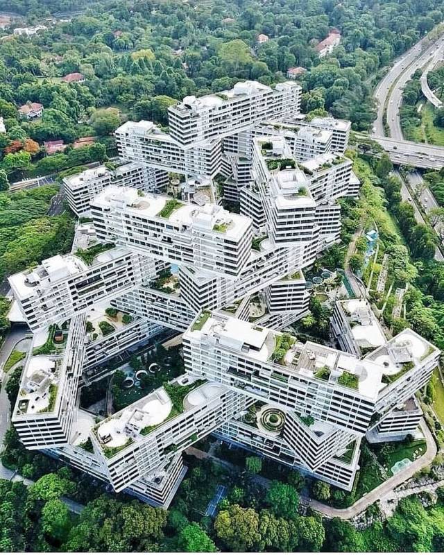 The Interlace是新加坡一项备受瞩目的大型兼新型高端公寓住宅综合体。项目由OMA建筑事务所及奥雷·舍人(Ole Scheeren)共同设计,这种相互交替的建筑类型打破了新加坡建筑标准都是独栋楼的准则,一个个垂直的公寓楼相互交错叠放,以一种特殊的方式探索截然不同的热带生活方式:一个通过公共空间和生活空间与自然环境集成而形成的扩展的生活互联网。整个建筑群有31个公寓楼,每个六层楼高,尺寸完全相同,他们在一个有着8个大开口和通透庭院里堆积并叠加呈六边形排列。这些连体建筑楼群形成一个垂直村落,拥有串联式的空中花园和私密及公共屋顶平台。
