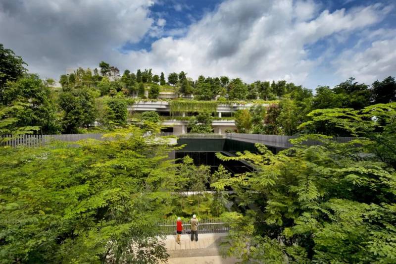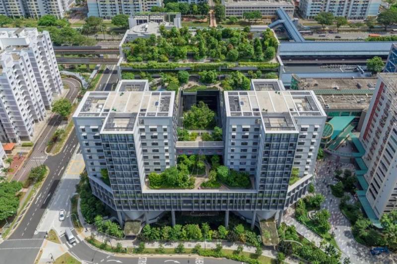 由WOHA建筑事务所设计的Kampung Admiralty是2018年世界建筑节年度最佳建筑奖获奖作品。它是新加坡首个将所有公共设施和服务空间融合在一个建筑体量里的公共建筑综合体:项目下层区域是一个社区广场,中层区域是一个医疗中心,上层区域则是社区公园和老年公寓,形成了一个垂直村落。这三个不同层面的空间囊括了各种建筑功能,以促进功能空间之间的交叉性和多样性,同时将地面空间留给大众,方便其进行各种活动。这种设计概念拉近了医疗健康、社交活动、商业和其他便利设施之间的距离,又加强了多代人之间的联系。