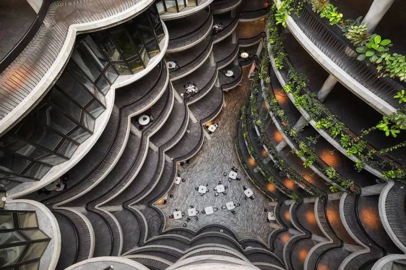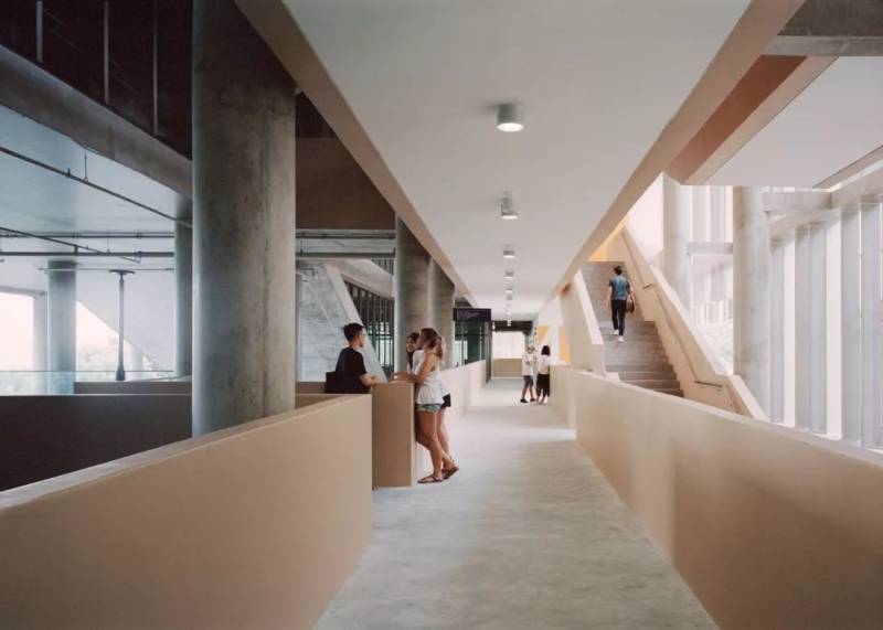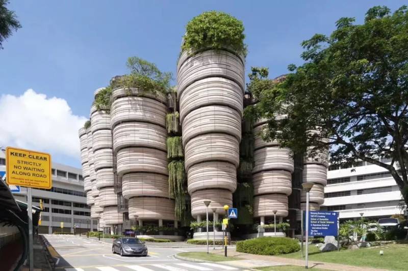 “The Hive”是一座蜂巢式的基于互联网时代的大学交流中心,因其形似广式早茶文化里的蒸笼,又得一昵称“小笼包”。它是英国建筑师托马斯·赫斯维克(Thomas Heatherwick)第一个真正意义上落成的建筑作品。建筑是在混凝土加入了颜料才得到这种特殊的浅色系;建筑没有主入口也没有大门,可以从各个方向进入中庭;开放的中庭空间使得围绕教室的空气得到最大化循环,对身处热带的新加坡来说再合适不过。