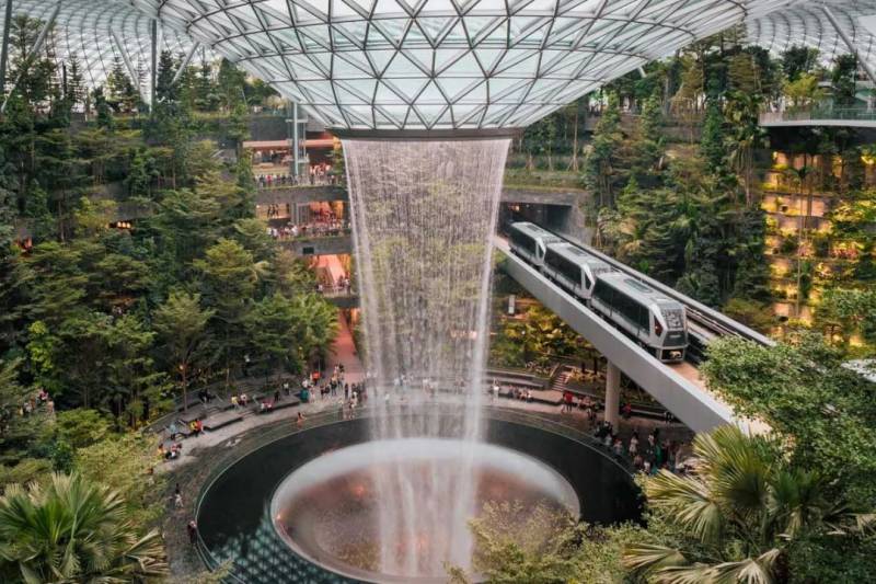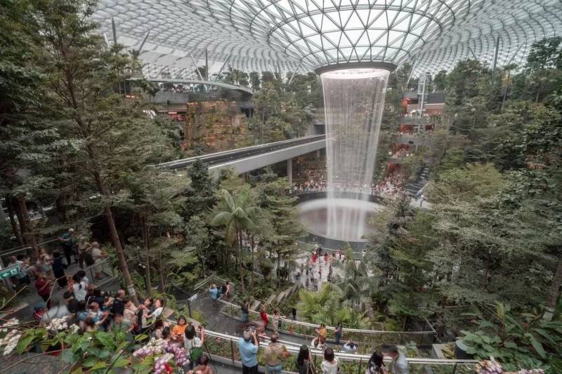 继金沙酒店之后,萨夫迪建筑事务所又为新加坡带来了一座崭新的地标:樟宜机场珠宝喷泉厅。创世界纪录的40米高室内瀑布呈环形涡状,由向内凹陷的玻璃天花倾泻而下,直落7层。萨夫迪将其设计在整座机场的中心,并以此为圆心,构想了绿意盎然的室内景观。