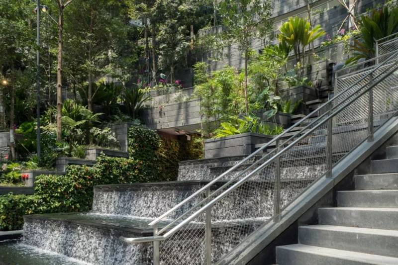 考虑到新加坡是一座雷雨频发的城市,室内瀑布的设计,除视觉震撼外,也担负着分流雨水的功用。其排水速率可达10,000加仑/分钟,留存下来的水流还可在炎热的夏日降低室内温度,并被循环利用。