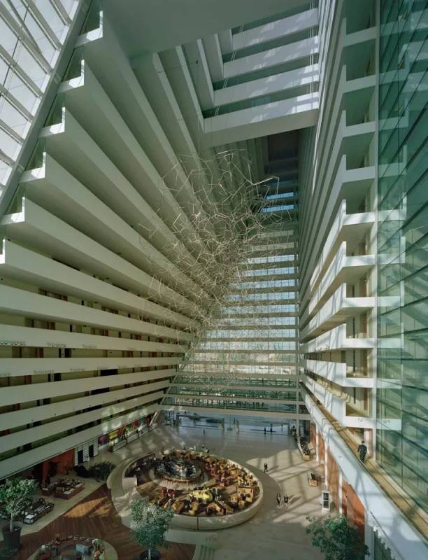工程公司布罗·哈波尔德(Buro Happold)完成了瀑布之上的玻璃天花和弯曲如甜甜圈的钢结构屋顶。它们纵横延伸,直径达到两百米。