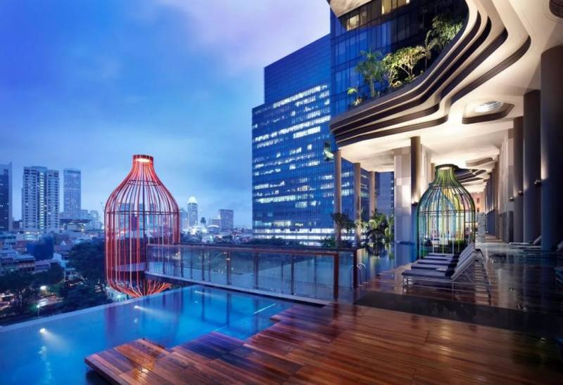 新加坡建筑事务所WOHA一直在提倡终极的“绿色城市”概念,位于皮克林的宾乐雅酒店就是他们设计的经典案例之一。拥有着巨型曲线的空中花园,覆蓋着热带植物,支持着大片的鸡蛋花和棕榈树,每隔四层悬挑在客房之间。整个建筑群绿意盎然,酒店的树木和花园似乎与毗邻公园的树木和花园融为一体,成为城市绿地的延伸。