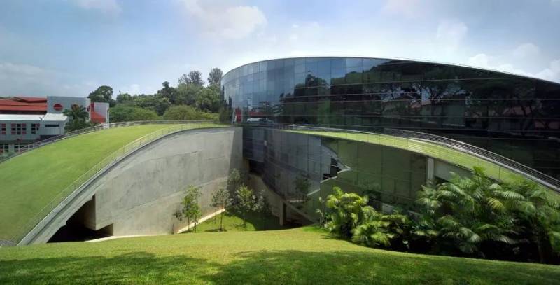 位于南洋理工大学校园内的这座建筑,毫无疑问最吸睛的部分是它的屋顶:相互交织的绿色屋顶看起来就像与校园地形融为一体,面向内部水池花园的一面为玻璃幕墙,绿色屋顶地下则是混凝土教学楼。在强烈的视觉冲击力之外,草坪屋顶不仅可以为建筑及其周边环境降温,也作为校园内公共活动空间的一部分使用(设有台阶可登上屋顶)。