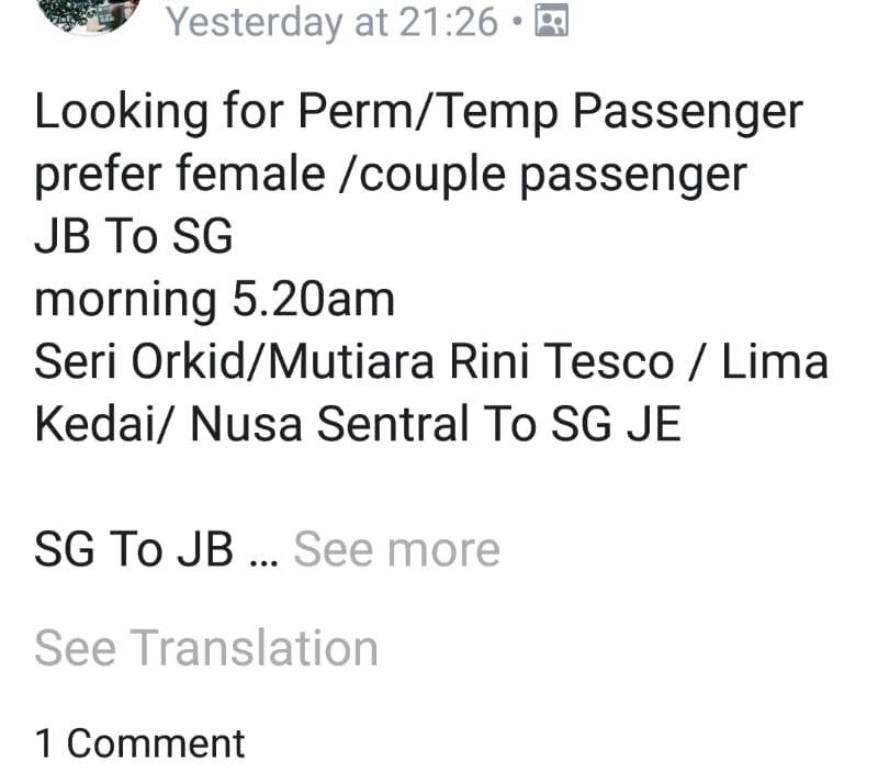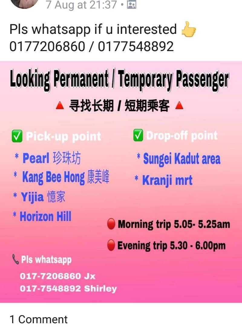 若四名乘客共享一辆7人座的马来西亚注册车辆,单向服务价格介于50元至80元。其中,168 Go Heng还表示,如果乘客选择乘搭新加坡注册的车辆,将会比马来西亚注册的车辆贵上40元。