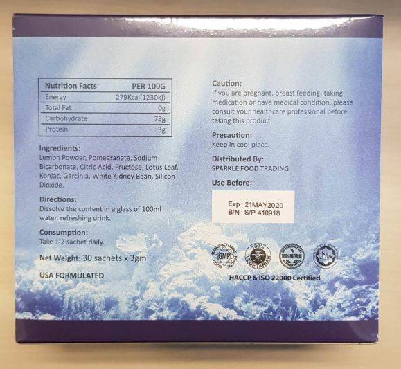 据了解,Body Slim Herbal 之前声称是100%天然成分,见效快又不会有副作用。同样的,Sparkle Twins也声称含有100%天然成分,作为柠檬和石榴味饮料销售,以促进减肥。