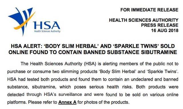 新加坡卫生科学局(HSA)于昨天(8月16日)发布文告说,本地有两种减肥药被查出含有一种称为西布曲明(Sibutramine)的禁用物质,会严重危害健康。