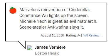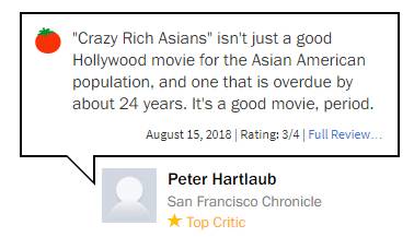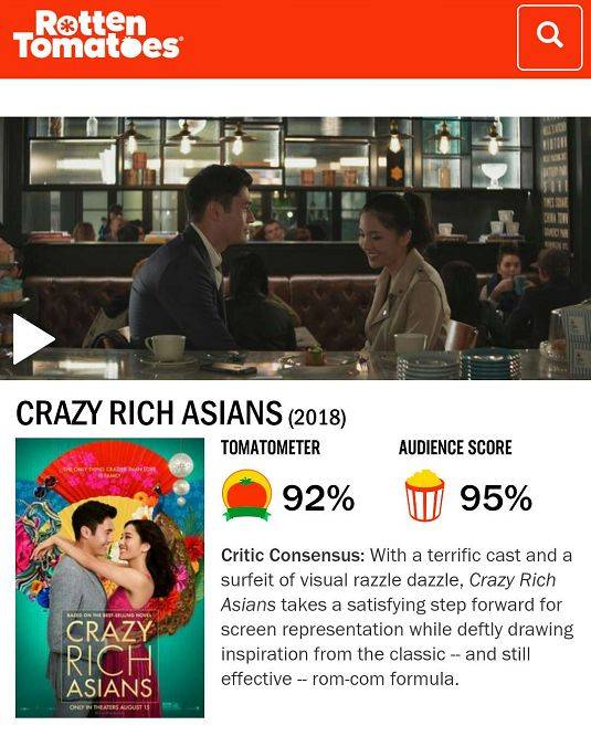 “《疯狂的亚洲富豪》不只是一部对于亚裔美国人来说超赞的好莱坞大片,同时也是一部晚了24年的电影。总之这是一部好电影。”