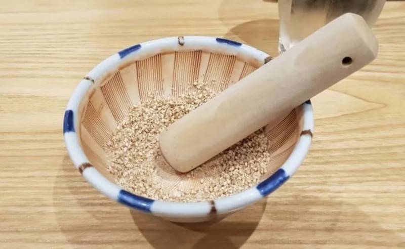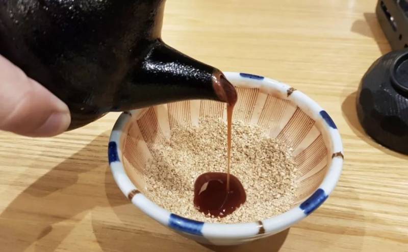 将芝麻末和炸猪排酱料混合在一起蘸着猪排吃