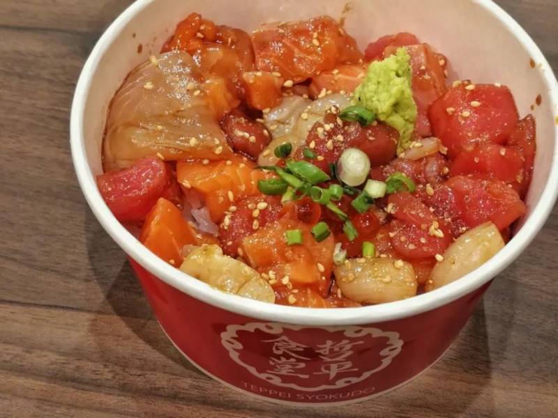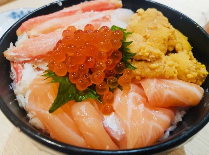 新鲜的三文鱼、元贝等海鲜切成丁拌著日式酱油