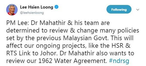李显龙在推特发布国庆群众大会演讲部分内容时,指马哈迪与其团队决定检讨前朝政府定下的政策。(截自李显龙推特)