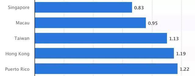(全球224个国家(或地区)中,生育率最低的前5名依次为:新加坡、澳门、台湾、香港、波多黎各。)