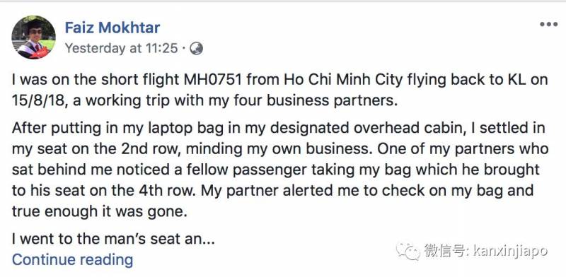 昨天,网友Faiz Mokhtar在Facebook上分享了他在商务舱被盗取个人财务的经历: