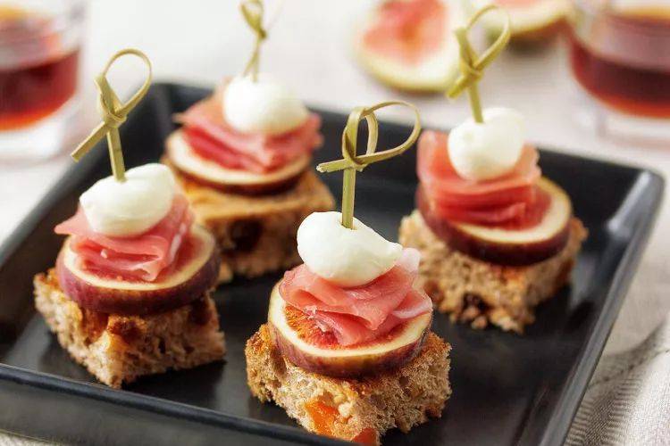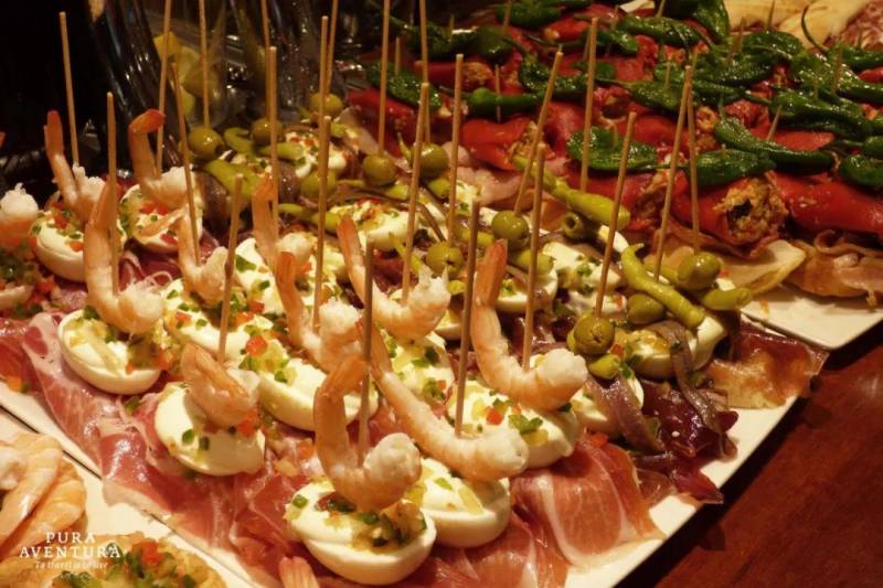 Pintxos是用牙签串著烤面包、腌橄榄、西班牙火腿等