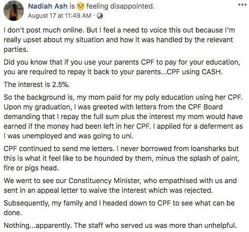由于Nadiah接下来还要继续入读大学,她试图申请延迟还款。可是CPF仍继续寄信,让她觉得自己好像不断地被高利贷骚扰一样。她甚至认为,CPF比高利贷还残忍。