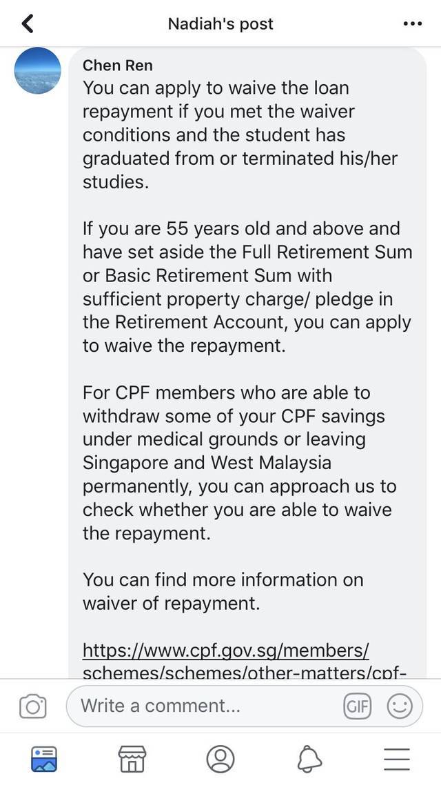 还有网友建议Nadiah每月偿还$100,直到母亲55岁,并且CPF户口里有足够的退休金,就能申请撤销还款。