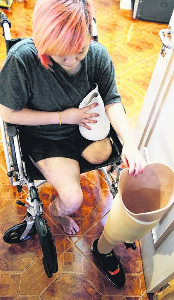 女郎原持有登山及潜水协导者执照,却再也无法爬山下水,仍在学习用义肢走路。