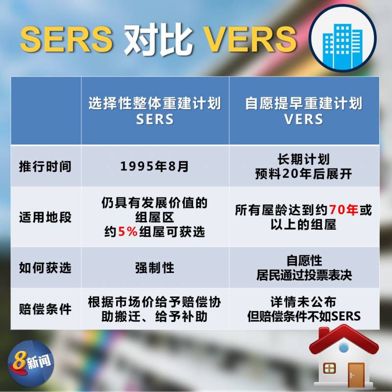 政府将推出新的自愿提早重建计划(VERS),以便对成熟市镇和屋龄在70年以上的组屋进行更有规划的整体重新发展。自愿提早重建计划与现有的选择性整体重建计划(SERS)又有哪些不同?
