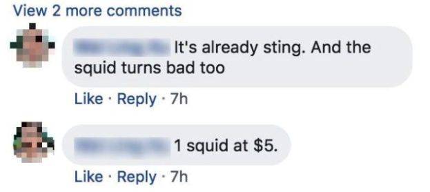网友抱怨说,一条鱿鱼5新币,而鱿鱼里面的这条鱼已经在腐烂了,弄得鱿鱼也变坏~~