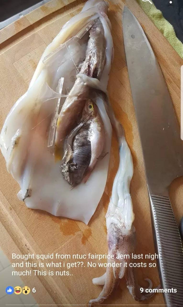 最近有网友在脸书上投诉,自己花那么多钱在NTUC买了条鱿鱼,切开之后居然是这样!