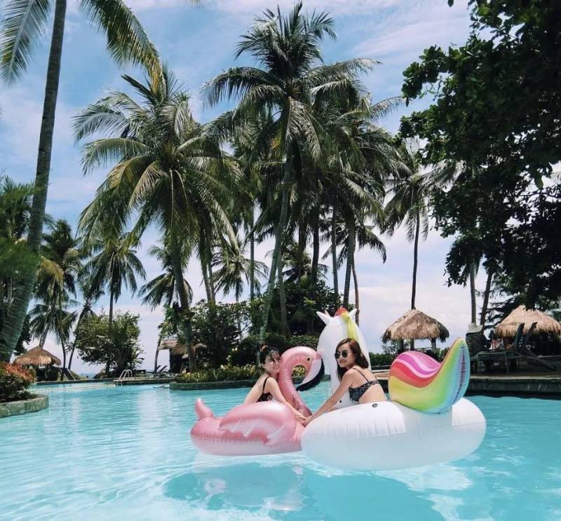 泳池的标配:网红游泳圈,在椰林树荫下变得十分动人。