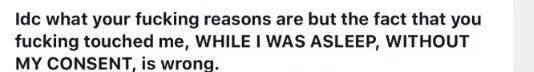 ”不管TM原因是什么,你没经过我允许,在我睡觉时候TM碰我,就是错的!“