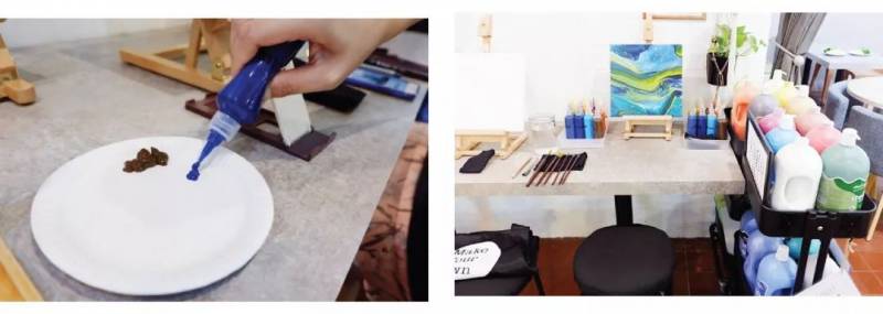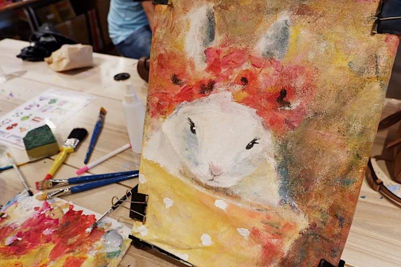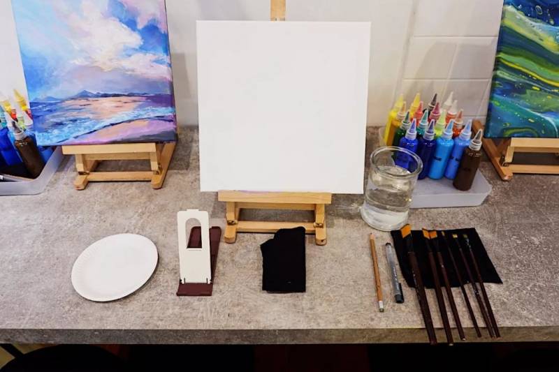 画板很小,画架在桌上。桌子旁边有绿植,看着就心情舒畅。画具排放的很整齐,包括围裙也是整齐的叠在椅子上。可以推测,根据客人的预定,工作人员会安排好所有的东西。