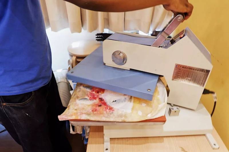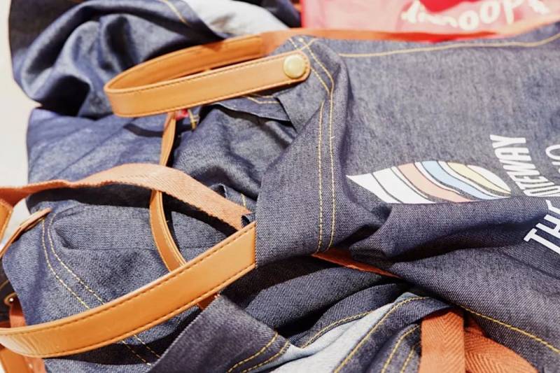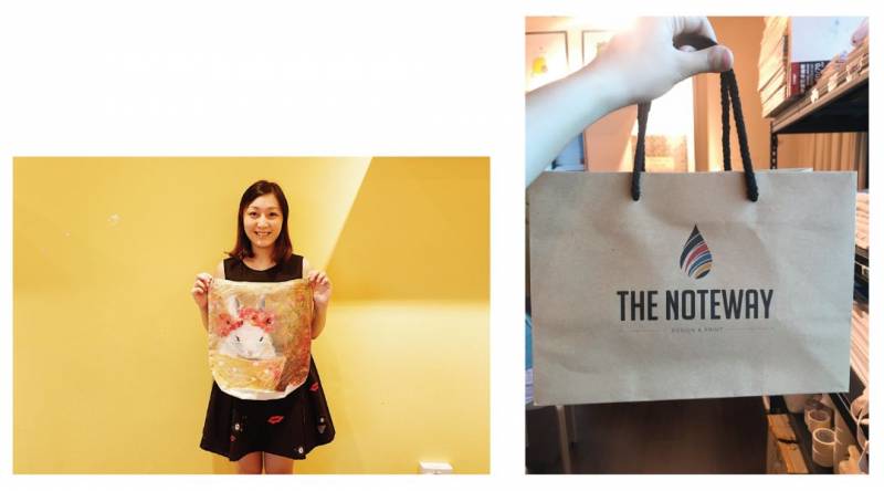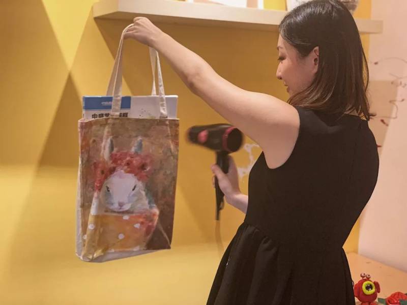 我们在那里也是十分尴尬了,四周都是人在忙活。到最后也是匆匆完成了画作,工作人员来帮我们使用热压器将颜料固色在帆布包上。我们询问有没有手提袋可以装,给我们了一个很精致的纸袋。