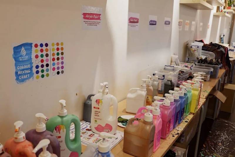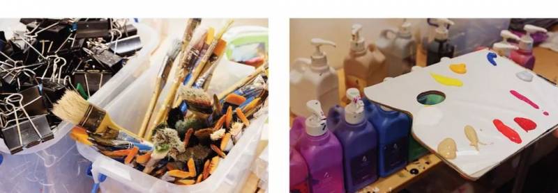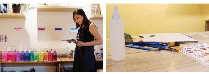 玩乐君怀疑这里的老板应该是有强迫症。进门需要脱鞋子,门口有鞋柜。工具以类别整整齐齐的摆放着,还以牌子标明工具名字。桌上也铺了透明的桌布,边边角角都整理的不差分毫。取颜料的那排桌子的地面也铺着透明的纸。