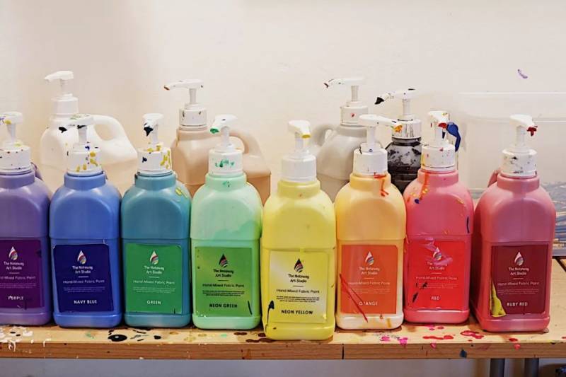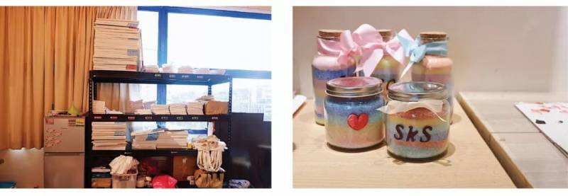 进门就能被多彩的壁画吸引。画室里面色彩很明亮。还发现除了t恤,帆布包,画板之外。还有沙画艺术可以制作。