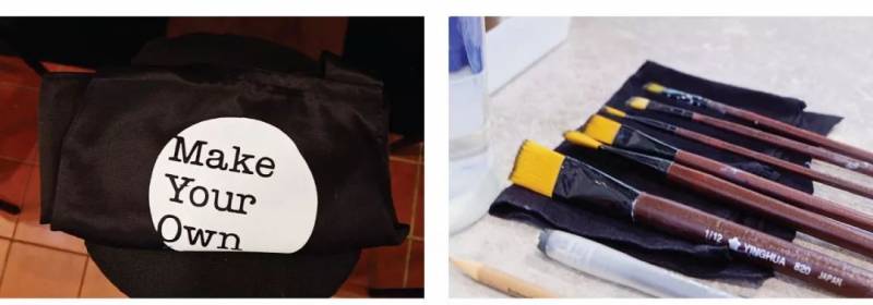 这里的画笔是清洗过的,但是清洗的不仔细。上面还有些许颜料残留。我们选择在帆布袋子上面画画。