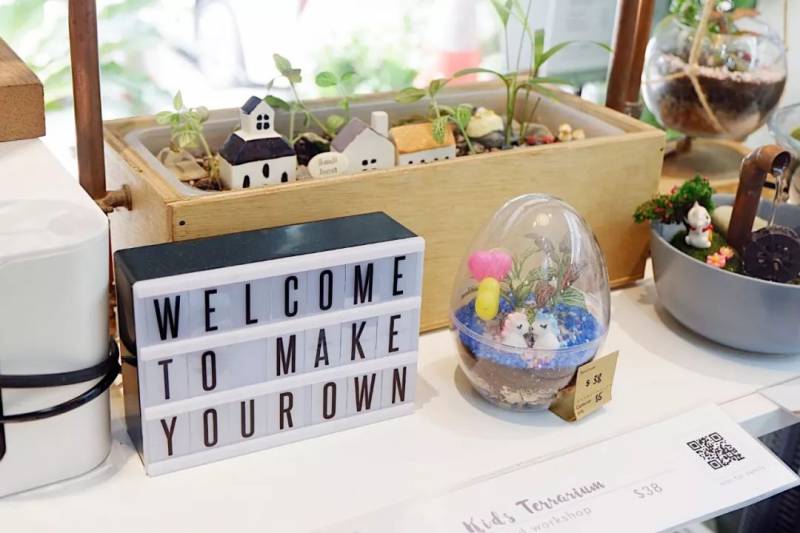 非常有情调的手作咖啡厅,隐藏在居民区中。外面是墨绿色的雨棚,搭配着落地窗。进去之后才觉得这是一家宝藏商店。除了画室体验之外,还有微景观,永生花,铜质灯制作的课程。