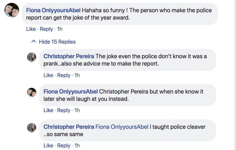 另一名网友Christopher Perreira就信以为真,并留言表示他将报警处理。他甚至在个人脸书页面上发文说自己被他人污蔑。