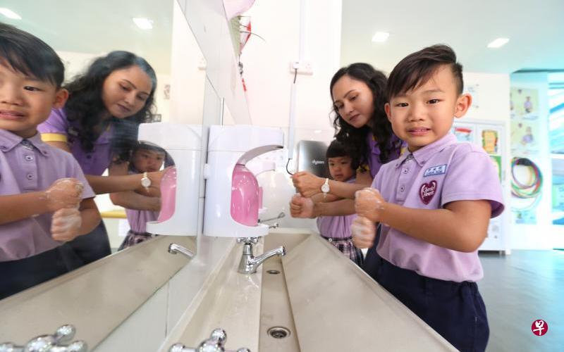 Cherie [email protected]连续三年获得新加坡卫浴协会颁发的康乐公厕认证。该学府的师长们都会传授孩子们正确的卫生知识,例如正确洗手步骤。(陈福洲摄)