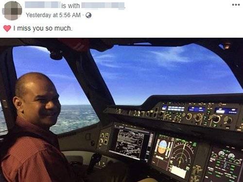 新航机师在吉隆坡骑摩哆时遇车祸身亡,妻子在面子书上载一张他坐在驾驶舱内的照片,留言“我非常想念你”。(取自面子书)
