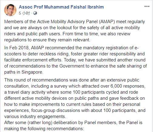 负责领导活跃通勤咨询小组的教育部兼社会及家庭发展部高级政务次长费绍尔博士今早在facebook发表文章,表示经过广泛的咨询和调查后,小组已向政府提交建议,修改个人代步工具的使用条例,以进一步保障使用者和行人的安全。