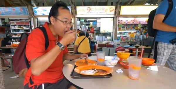 郑春林在视频中在小贩中心吃他人吃剩的食物。(视频截图)