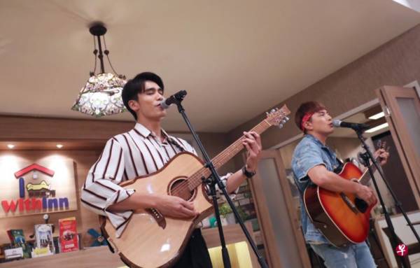 朱哲伟(左)和包勋评剧中自组歌唱组合。(陈来福摄)