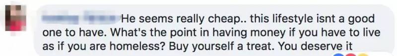 (我不认为他在做一件伟大的事情,如果你拥有很多,为啥要居住在如此糟糕的情况中呢。我完全不感冒。我不是说他要过上很精致闪闪的生活,但是吃剩饭实在接受不了)