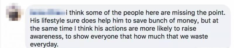 (我认为很多人没有抓住重点。他的生活方式当然可以帮他攒一大笔钱,但是同时,我认为他的行为更重要的是提醒大家意识到自己每天生活中浪费量有多大。)