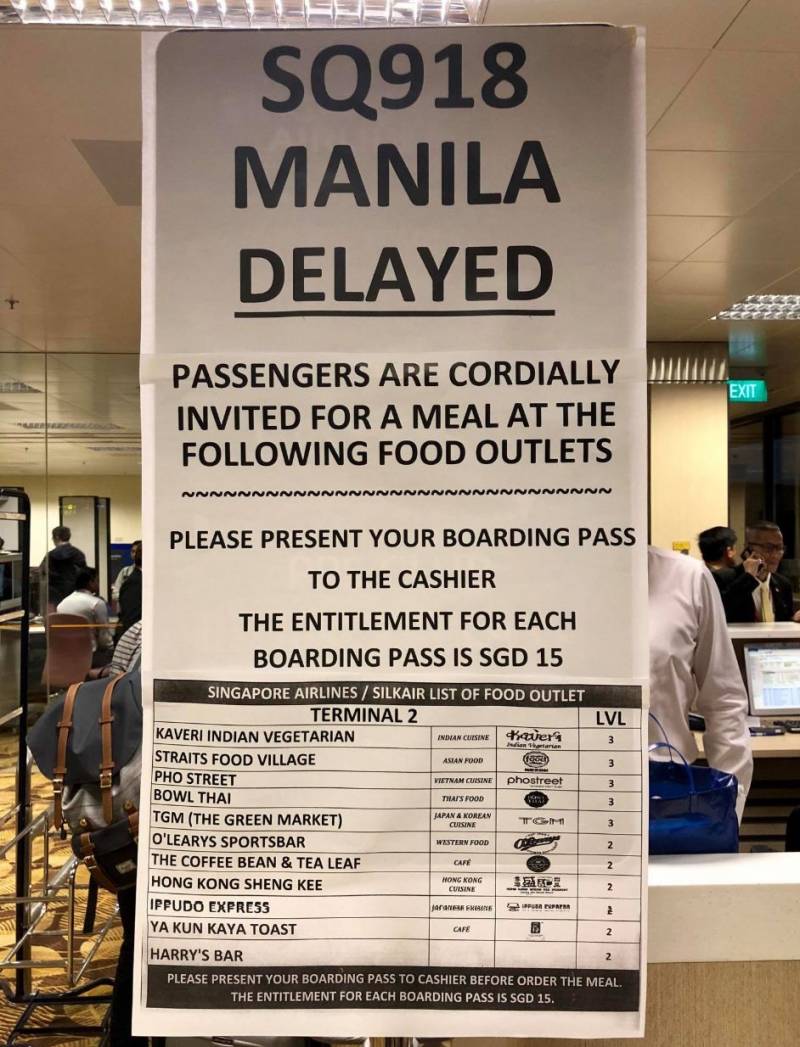 Marvin的航班应该在下午7点25分离开,但是晚上7点,有人宣布他们的航班将被延误。这让很多准登记的乘客措手不及,而且很多人原打算上飞机享用晚餐,毕竟新航的机上餐饮是出了名的好。可现在计划泡汤……