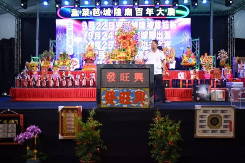 在歌台进行的同时,隔壁也会如火朝天的举办投标福物活动。投标福物活动是希望透过竞标福物所得,补贴第二年购买供品的费用,让供品更为丰富,同时大家普遍相信标福物可带来更旺的财运。
