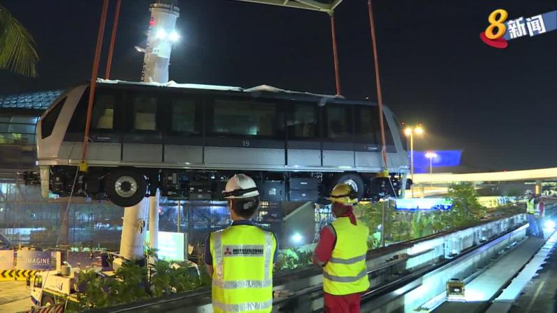 新列车在日本三原市组装,上个月底由海陆运抵我国巴西班让码头。为了减少对日常运作的影响,六列列车从这个月11日开始,分成三天,在午夜后从码头运送到樟宜机场。由于机场的轻轨列车处于高架桥上,所以需要动用吊车。