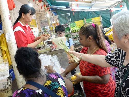 记者曾访问这位被居民投诉的蔬果摊位女助手,确实从远处就听见她的叫卖声,也见她随时转换“频道”,用各种语言与顾客们沟通。