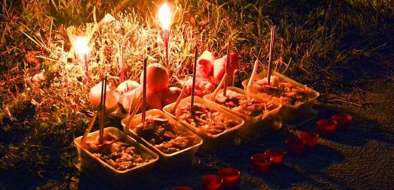 农历七月期间,你会在路上看到这样的场景:人们拿着食物作祭品祭拜,焚烧金银纸等等。