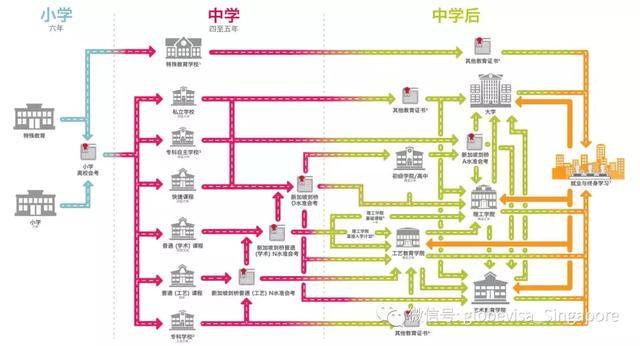 新加坡的小学学制是6年,小学四年级结束时,学生首次通过考试分流,按照考试成绩把学生分成特别优秀的、一般的和较差的三部分,三部分小学生进入不同的班级学习,三部分比例依次是15%,75%和10%;第二次分流是小学六年毕业时通过统一考试,也把学生分成三部分,成绩特别好的10%进入特选班,成绩良好的50%进入快捷班,余下的40%进入普通班。第三次分流发生在中学毕业,学生通过剑桥O水准考试,形成第三次分流,最好的30%进入初级学院和大学预科(相当于我们的高中),它主要为高等院校输送人才;接着的50%进入相当我国大中专的理工学院,余下的20%进入相当于我国职业高中的工艺教育学院。