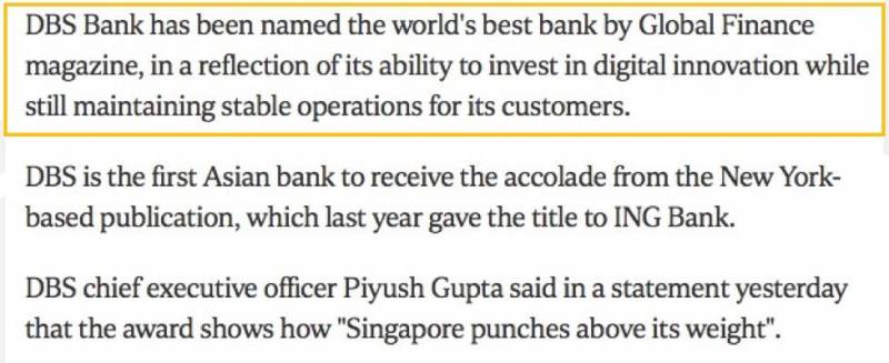 根据新加坡8频道新闻,联合早报,海峡时报等媒体报道,新加坡本地星展银行荣获美国《环球金融杂志》颁发的本年度全球最佳银行奖。