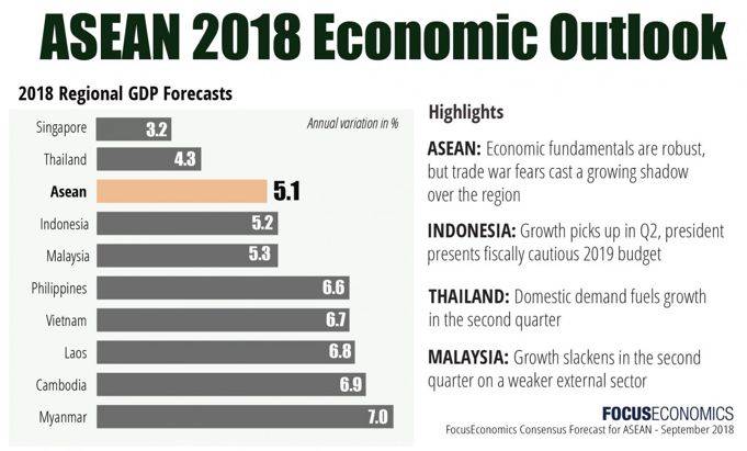 根据FOCUSECONOMICS的报道与分析,东盟经济体可能受益于强劲的劳动力市场,这应该支持私人消费,全球对该地区出口的强劲需求以及对印度尼西亚和菲律宾等经济体的健康公共基础设施投资。然而,鉴于两国作为出口市场的重要性,美中贸易战升级是增长的主要下行风险,而该地区更严峻的金融环境可能拖累内需。该地区的GDP增长预计今年将达到5.1%,比上个月的预测下降0.1个百分点。