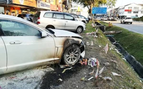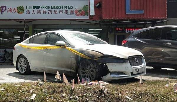 近日有照片在网上流传,一辆新加坡车牌的白色捷豹停在新山彩虹花园一带,右边车头被烧毁,轮胎部分也遭殃。