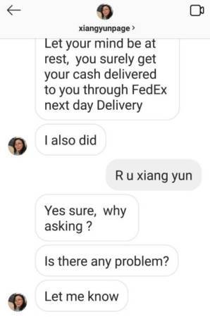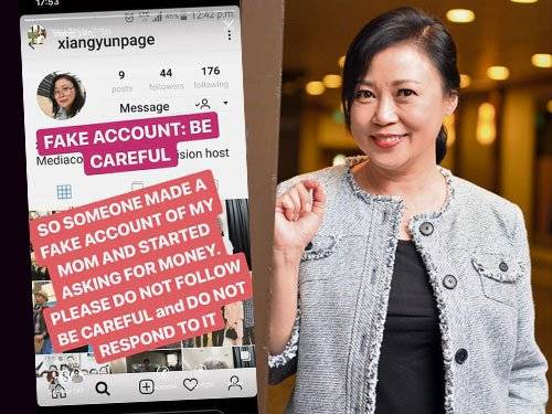 广告向云前天拍戏一整天,不知道有人冒用她的名字,来了一个Instagram假账号,向一些认识的人发英文信息宣传“国际货币基金”的投资方式,还声称投资可获30倍到90倍不等的回报。一名朋友后来联系陈之财,告知他这件事,陈之财才赶紧在社交媒体上代妻澄清,那不是向云的账号,希望大家不要上当。
